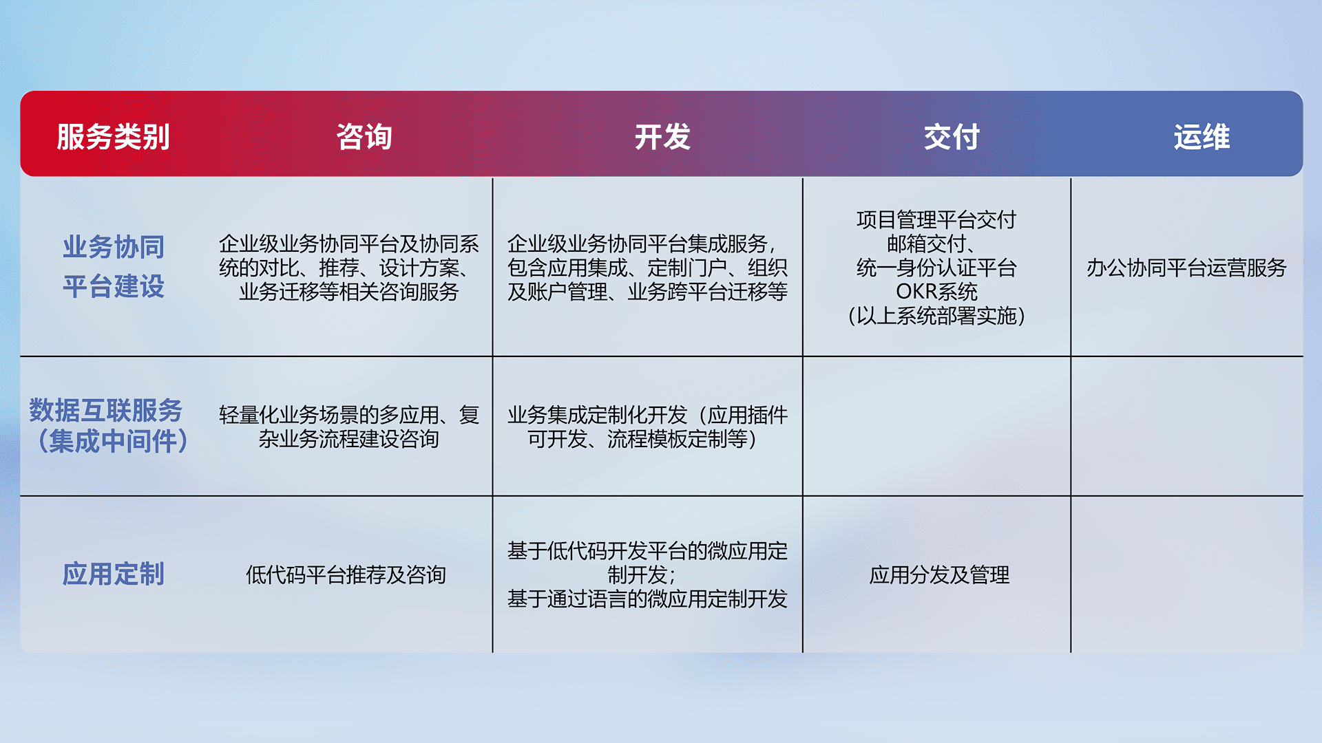 针对钉钉、、、、企微、、、、IDaas等平台级产品提供产品的规划、、、、方案、、交付、、、、定制化开发等服务,,,,实现如统一协同办公、、智能客户服务、、混合会议管理、、智能数据查询、、、、等业务场景,,实现数字化转型。。。。